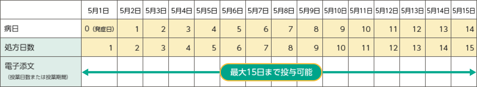 なお、最終の調製済み薬剤を投与してから24時間後に本剤の投与を終了してください。 (参照) ドラッグインフォメーションの「6. 用法及び用量」、「7. 用法及び用量に関連する注意」をご確認ください。5月1日に発症し、その日から処方を開始した場合